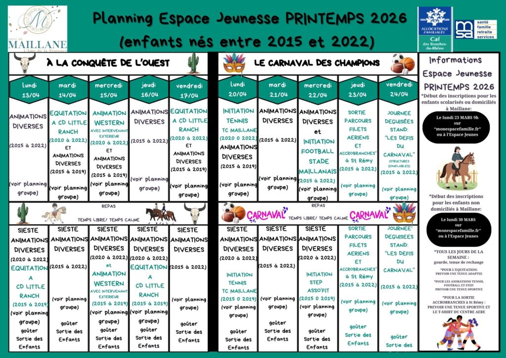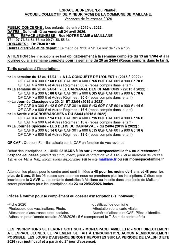 CONTACT : Yohan MIGRAN, Directeur. Tel : 07.76.34.54.76 ou 09.71.56.55.34 / Mail : espacejeunes@maillane.fr