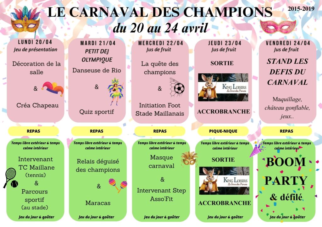 Chaque semaine de vacances, l’équipe d’animation propose aux enfants un thème différent (Astronomie, la Nature, les Animaux, le Théâtre, la Camargue, les Olympiades, le Cirque, la Magie, Les 5 continents, le Monde Médiéval…).