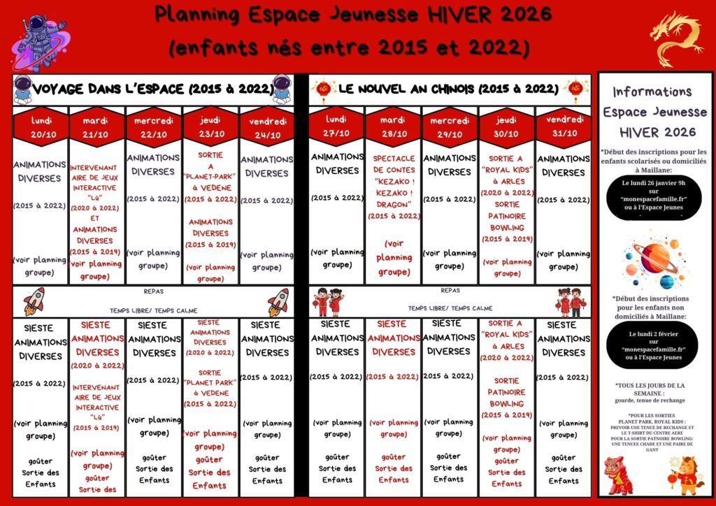 L’espace jeunesse "Lou Plantié" fonctionne durant les vacances d’Hiver, de Printemps, d’Eté (jusqu’au 15 Août), et celle d’Automne.