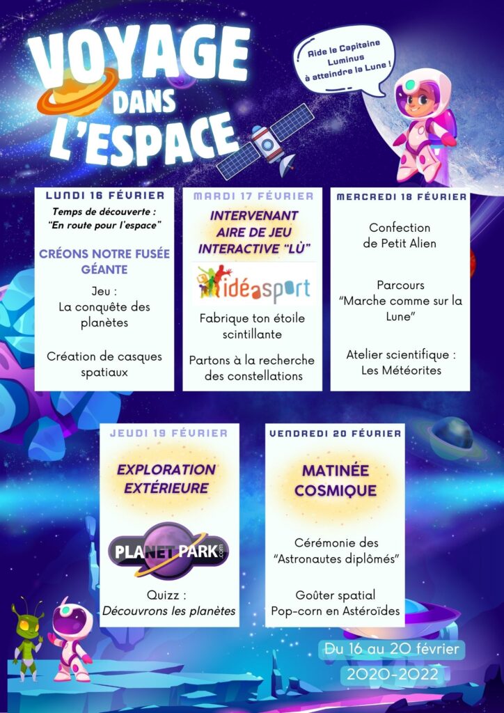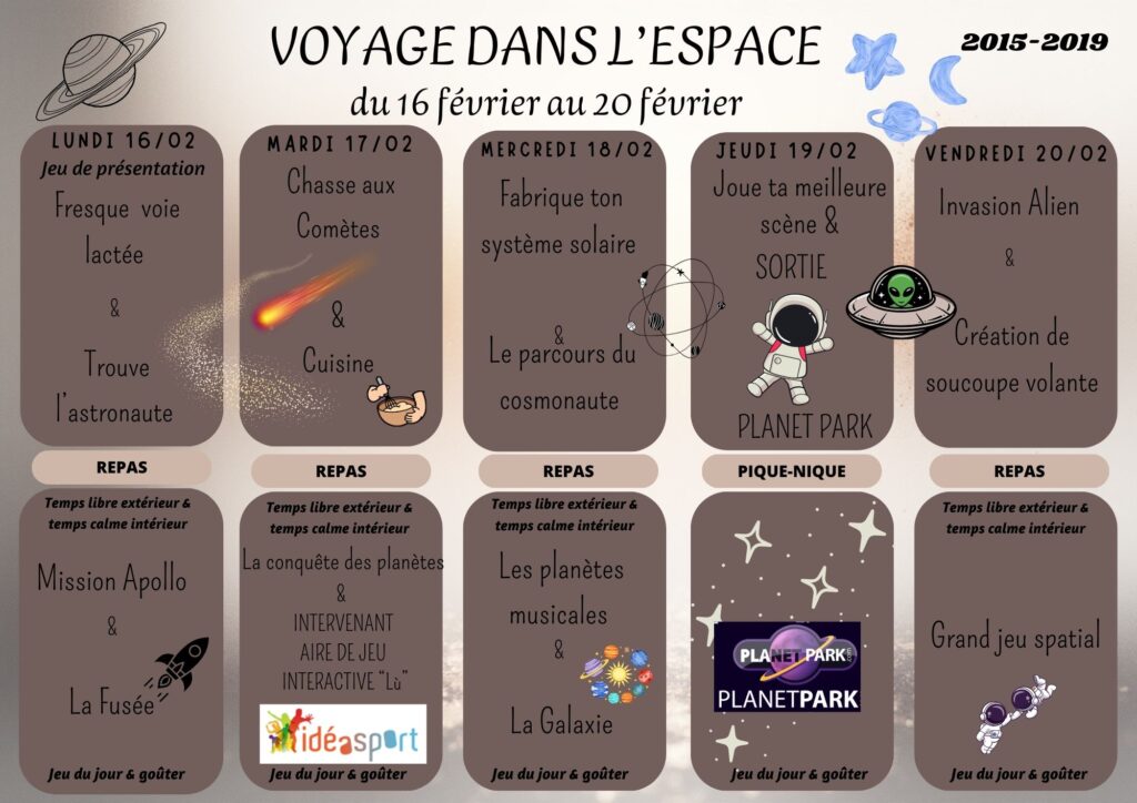 Chaque semaine de vacances, l’équipe d’animation propose aux enfants un thème différent (Astronomie, la Nature, les Animaux, le Théâtre, la Camargue, les Olympiades, le Cirque, la Magie, Les 5 continents, le Monde Médiéval…).