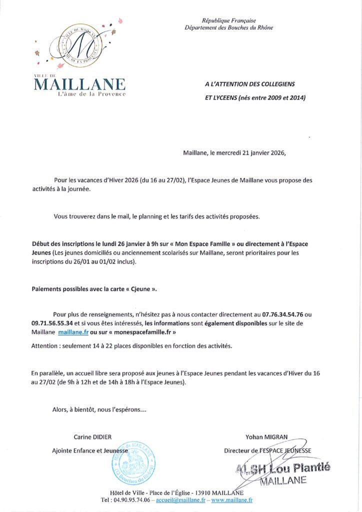 Mail : espacejeunesmaillane@orange.fr / Tél : 07.76.34.54.76 ou 09.71.56.55.34