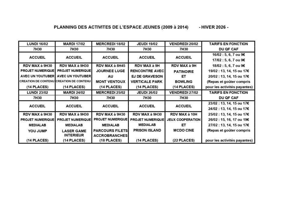 L’Espace jeunes "Lou Plantié " fonctionne durant les vacances d’Hiver, de Printemps, d’Eté (jusqu’au 15 Août), et celle d’Automne.